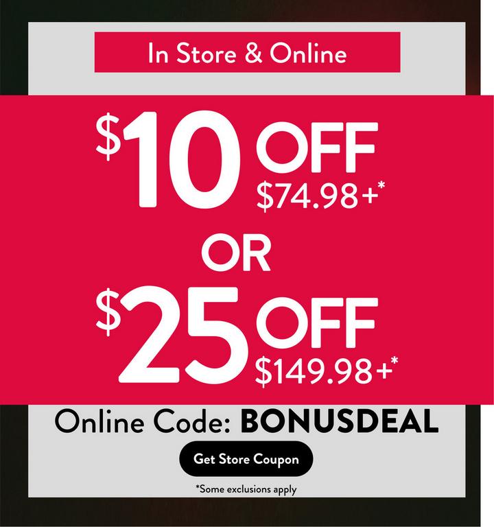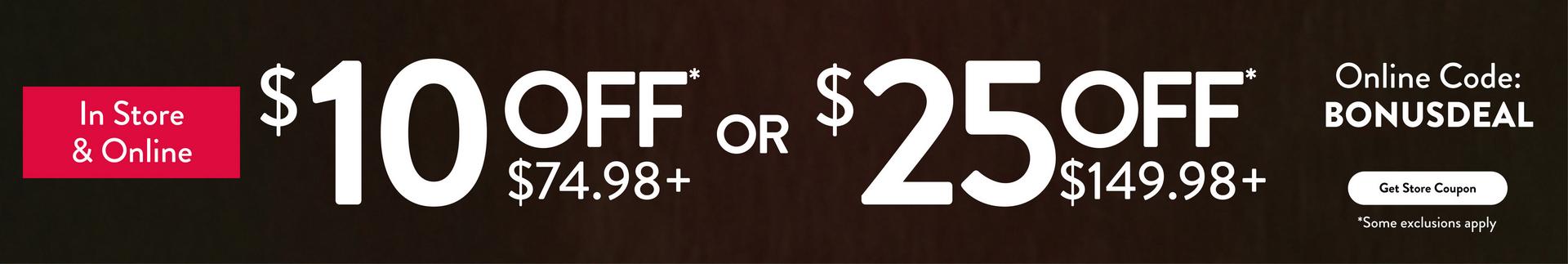 Buy more, save more with $10 off $74.98 or $25 off $149.98!