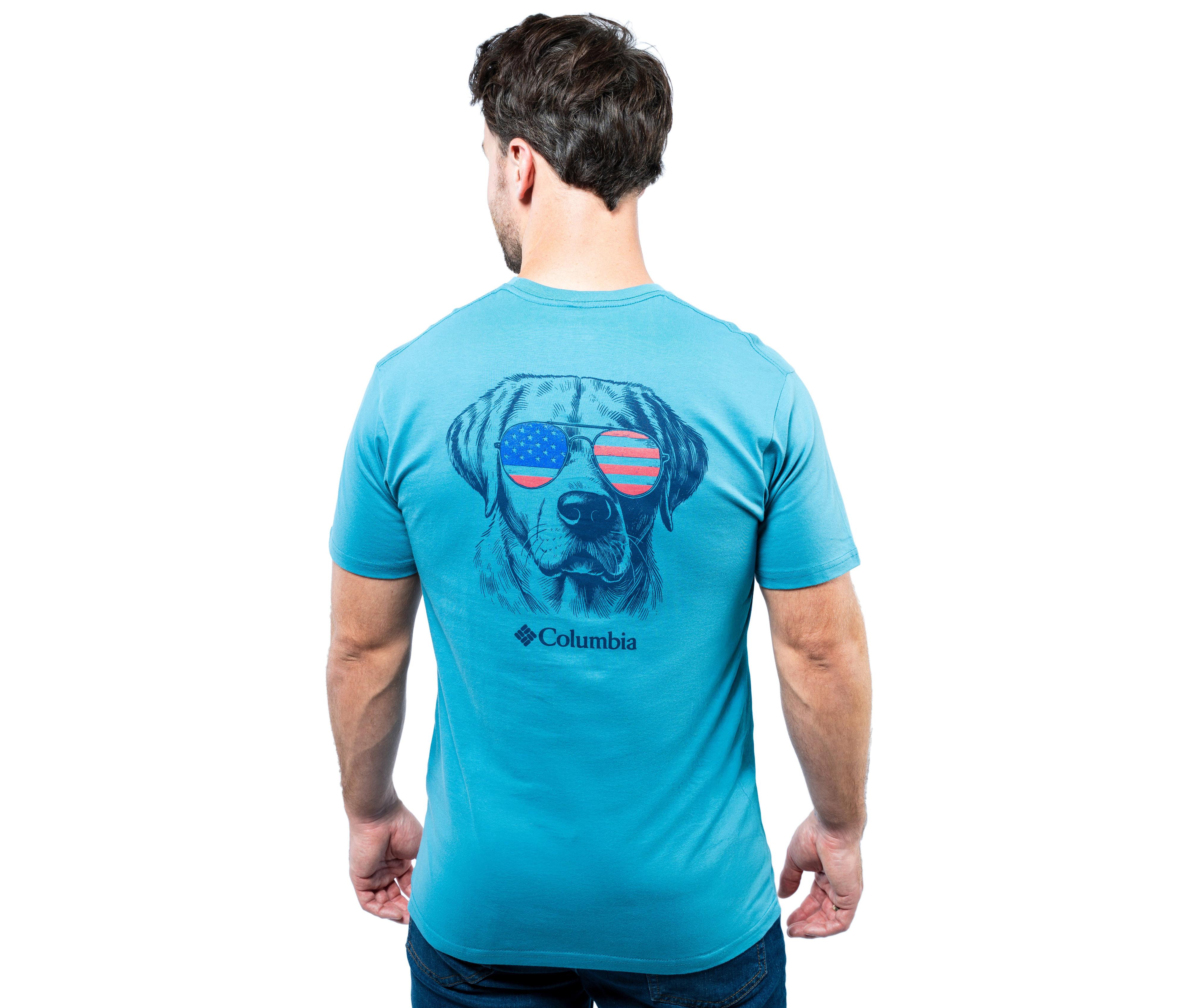 - Dog graphic with American flag sunglasses on front