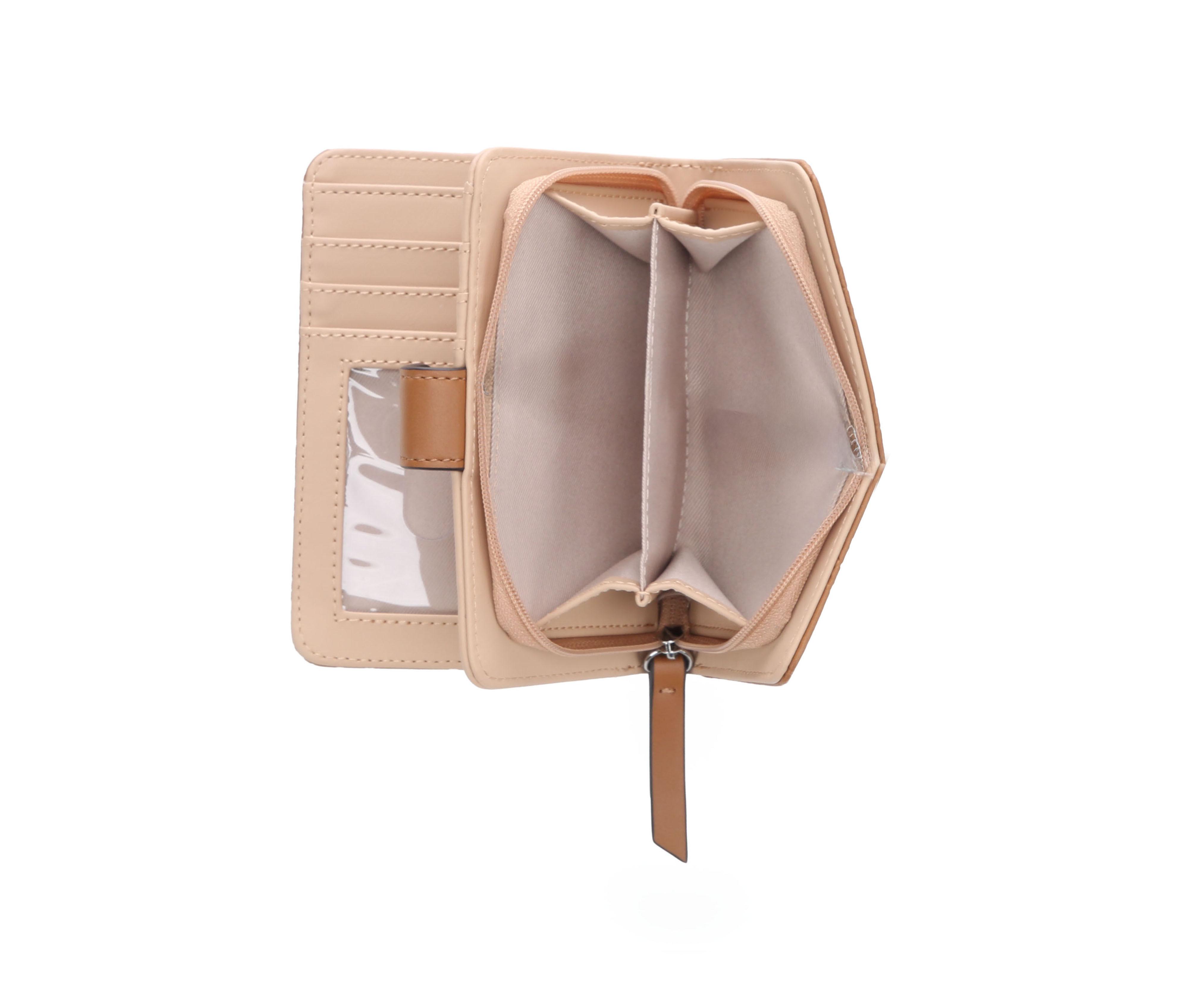 - Fold-over French wallet design with snap closure