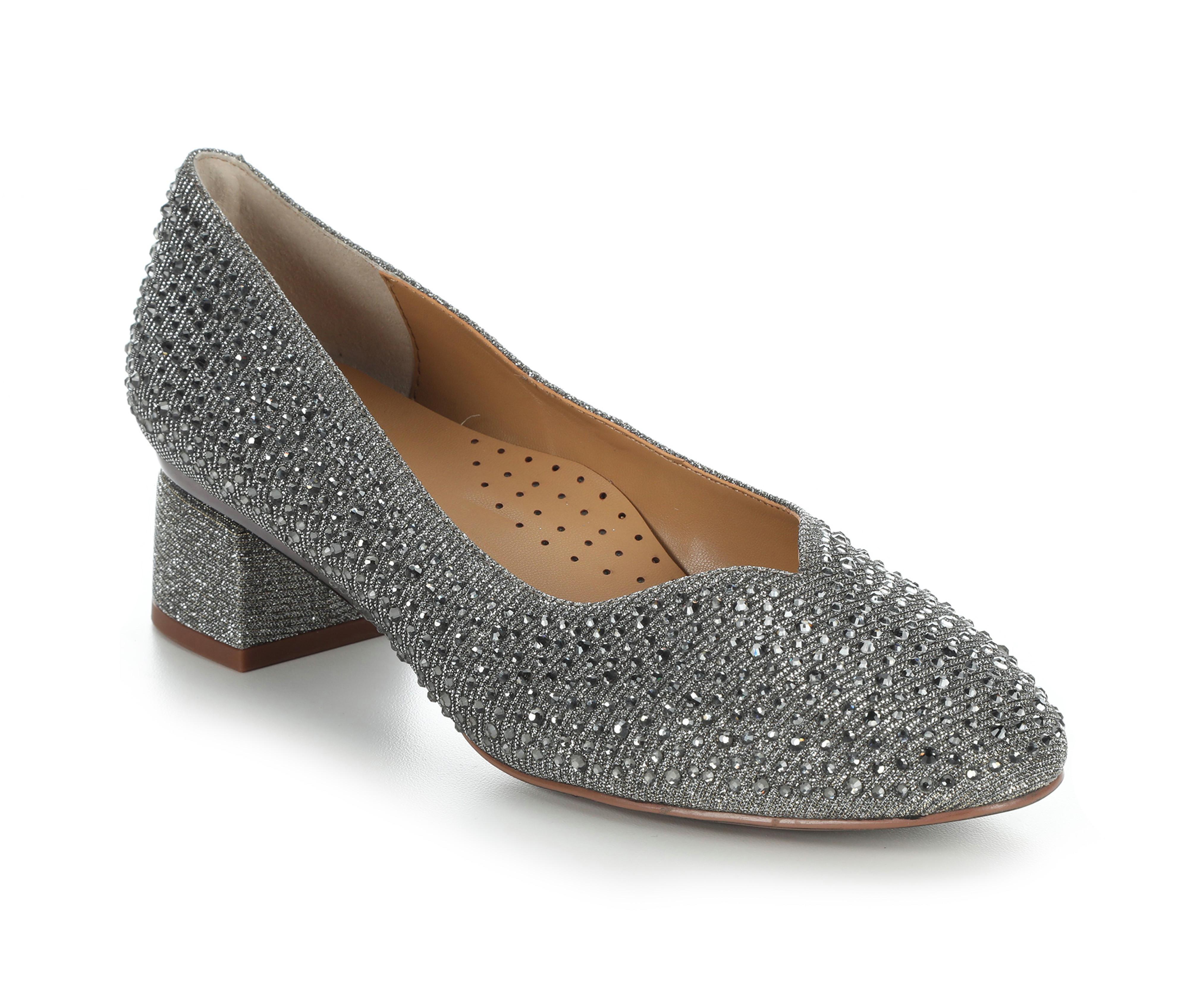 - Fabric upper with rhinestone embellishment