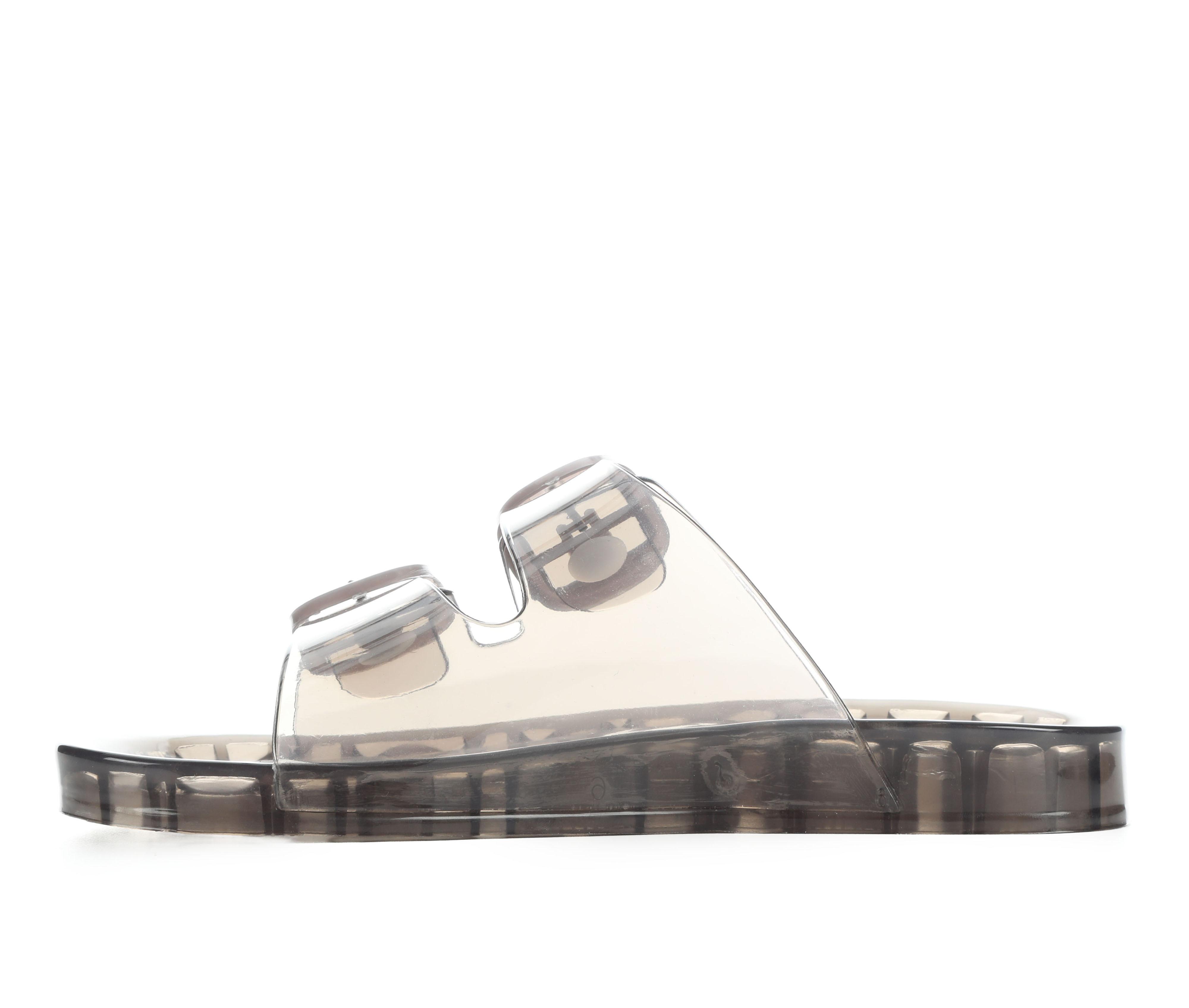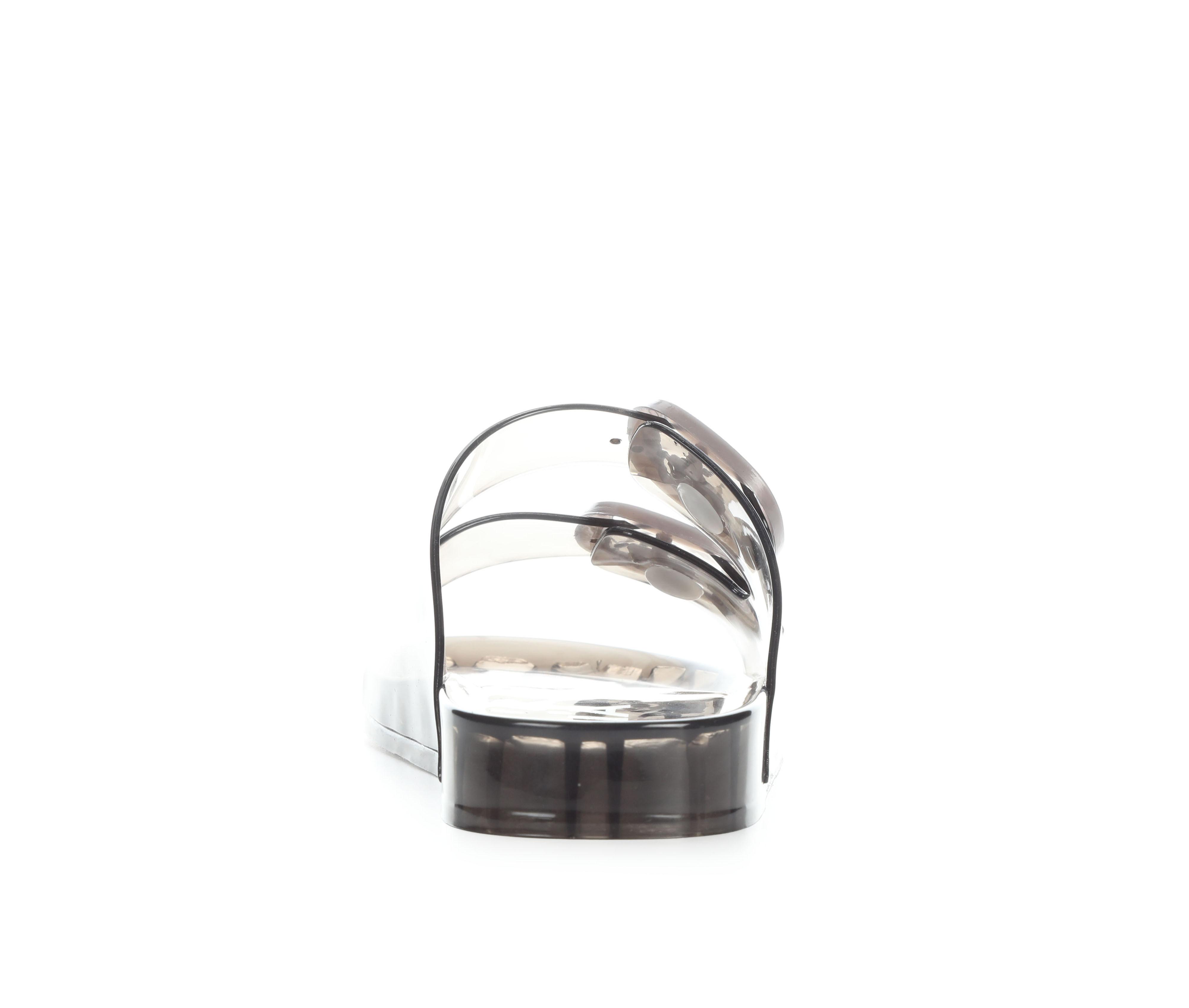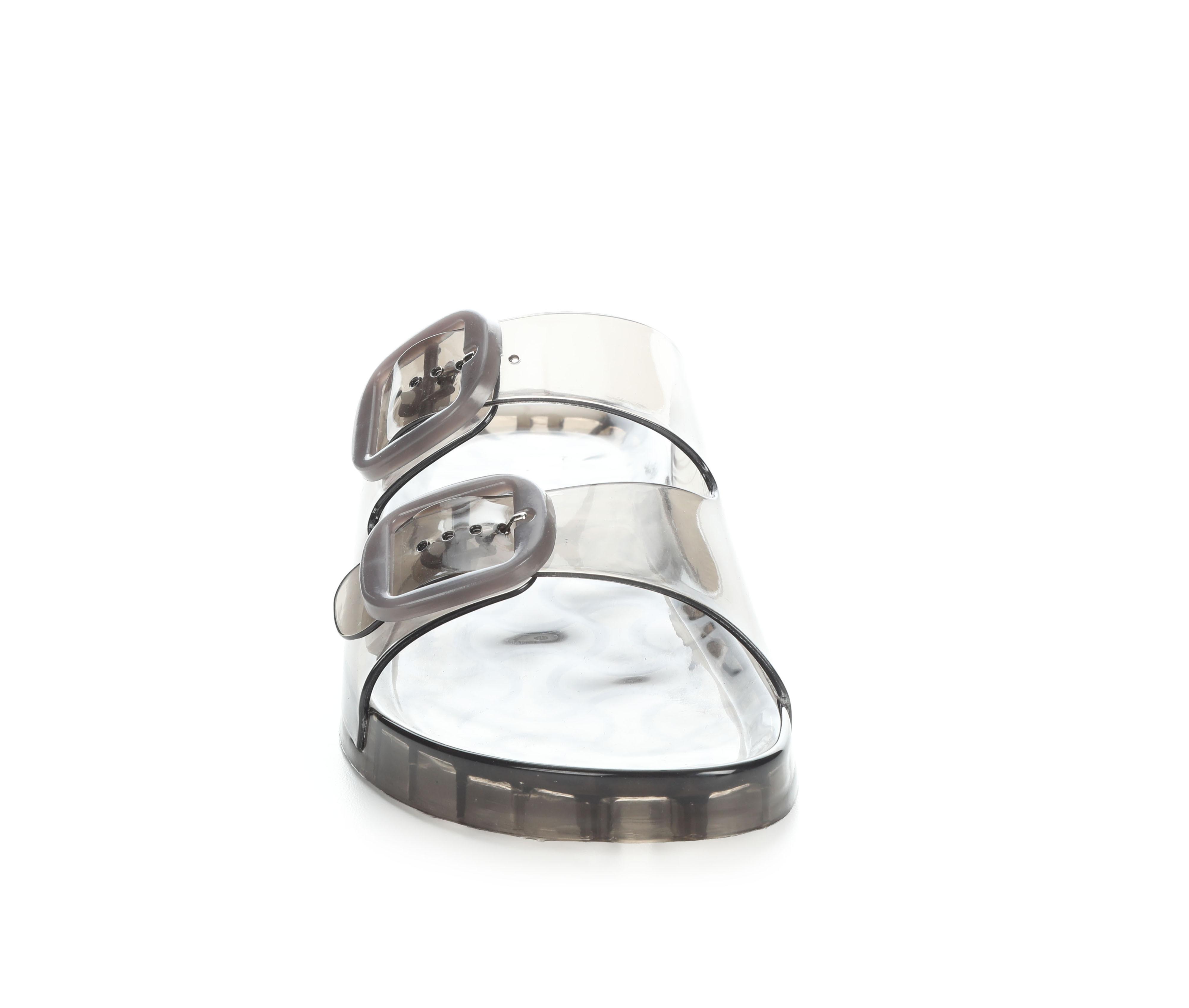 - Wide, translucent upper straps with oversized buckle detail