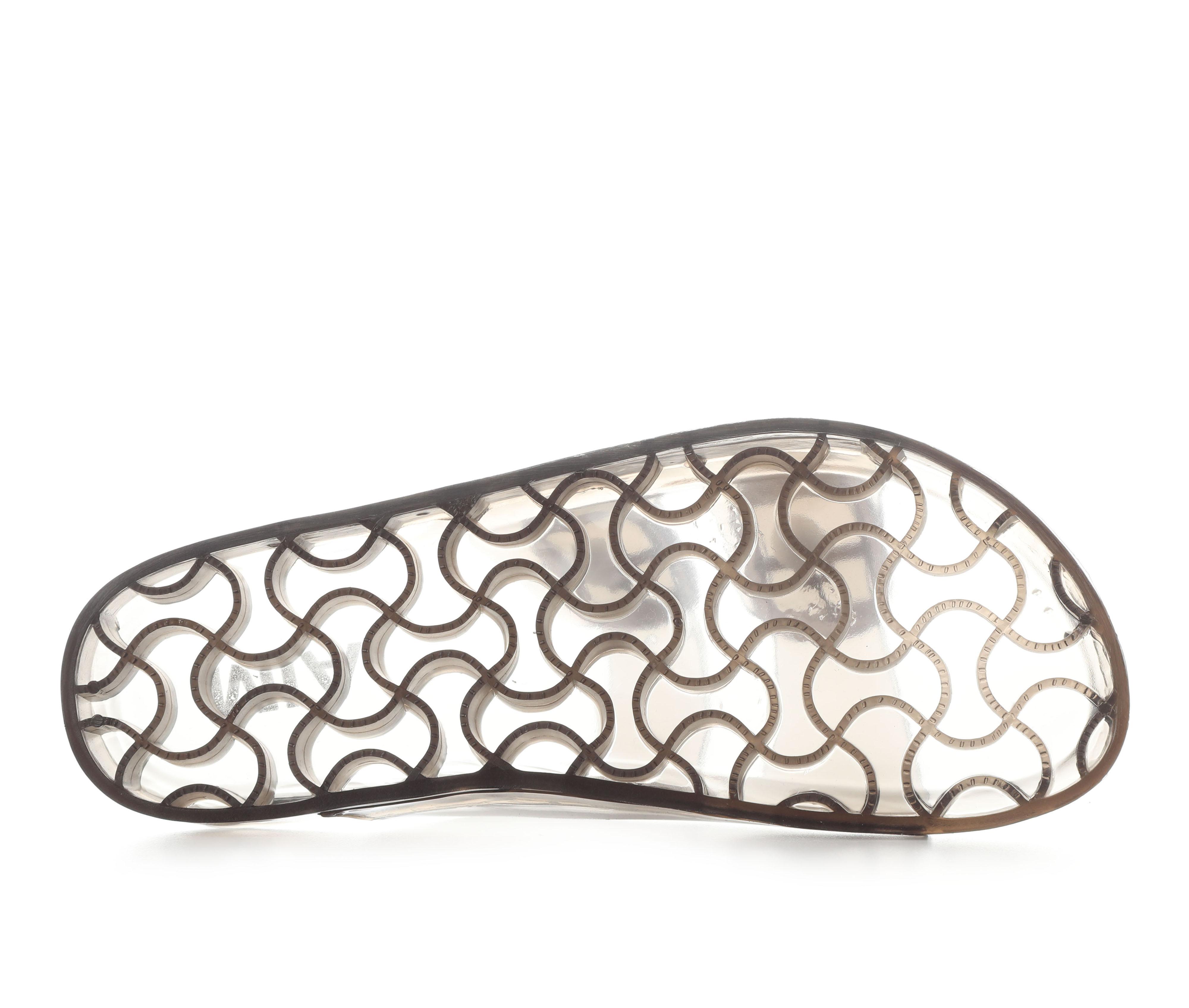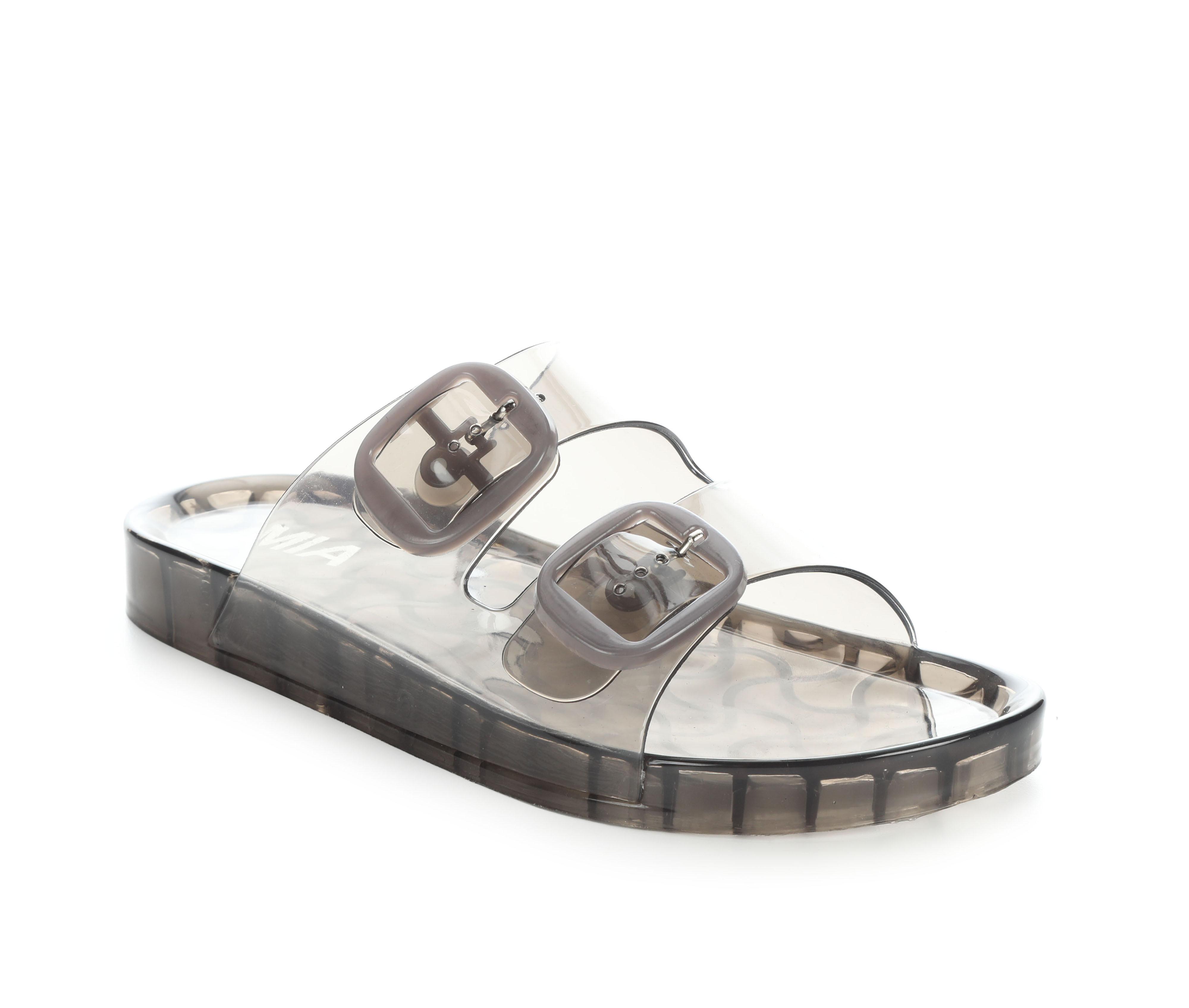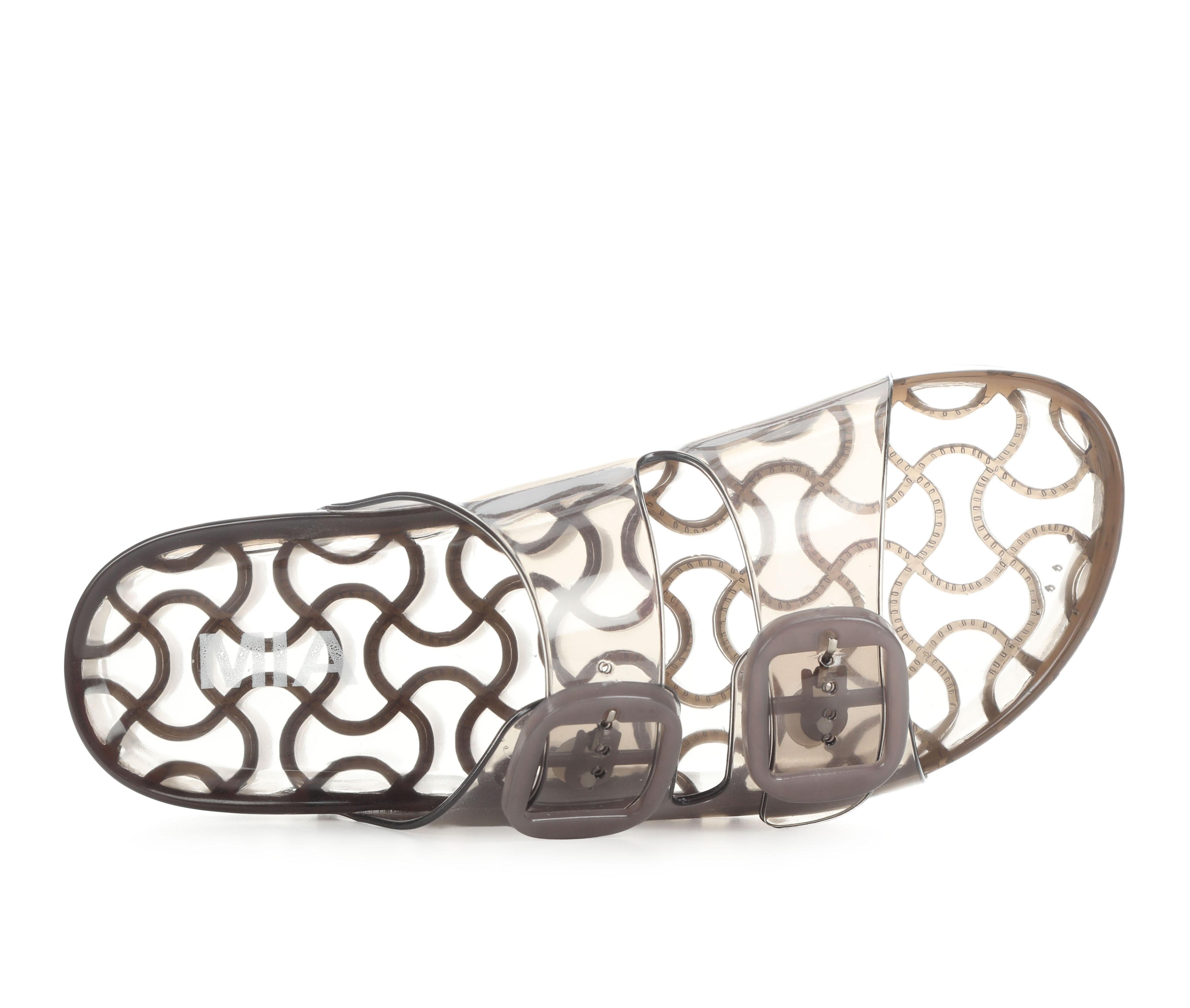 - Wide, translucent upper straps with oversized buckle detail