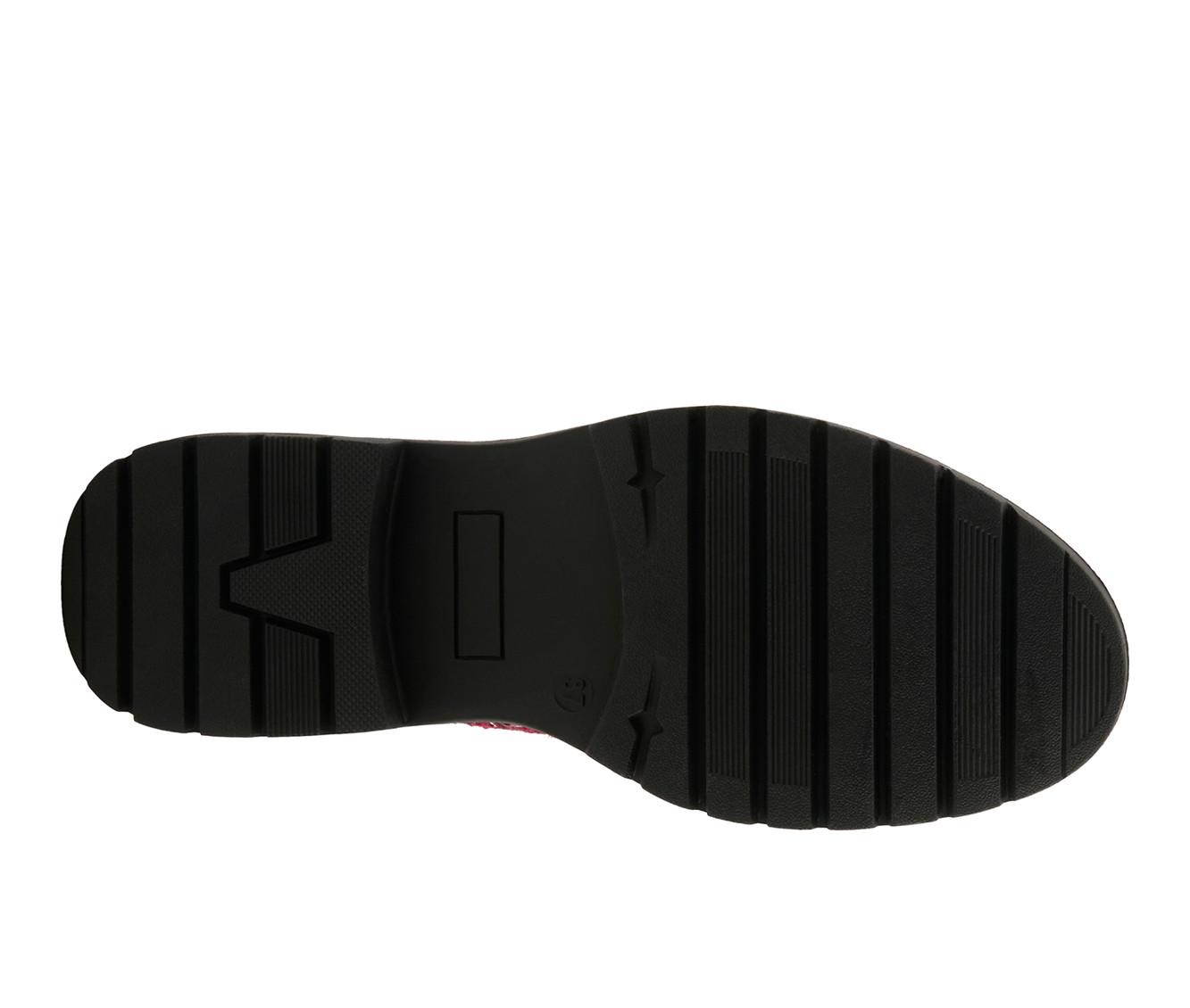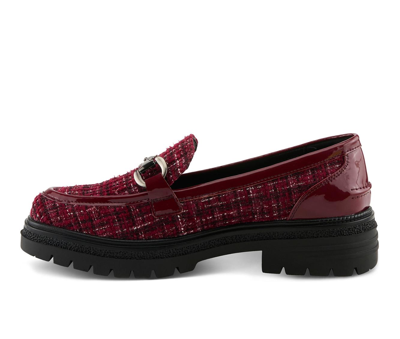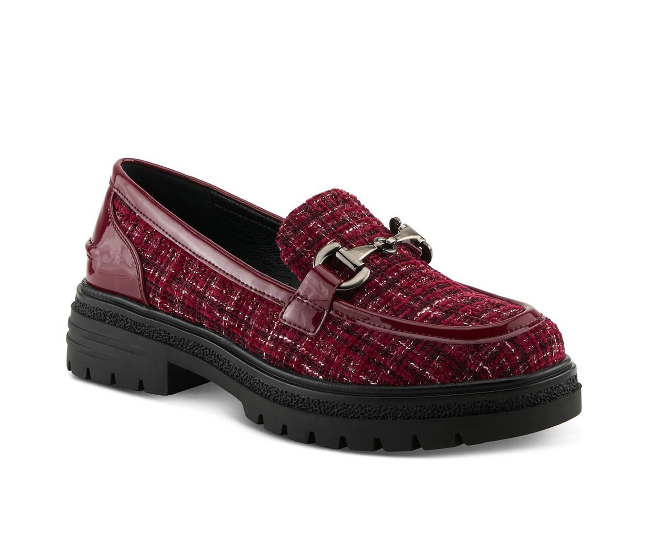 - Boucle/textile upper with faux-leather trim