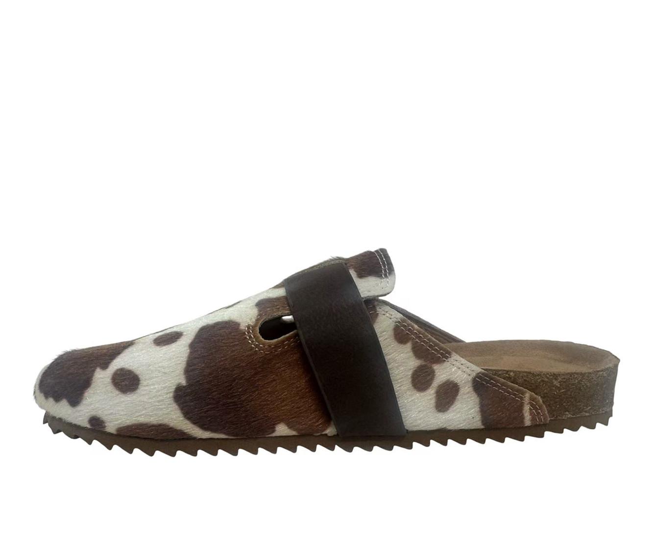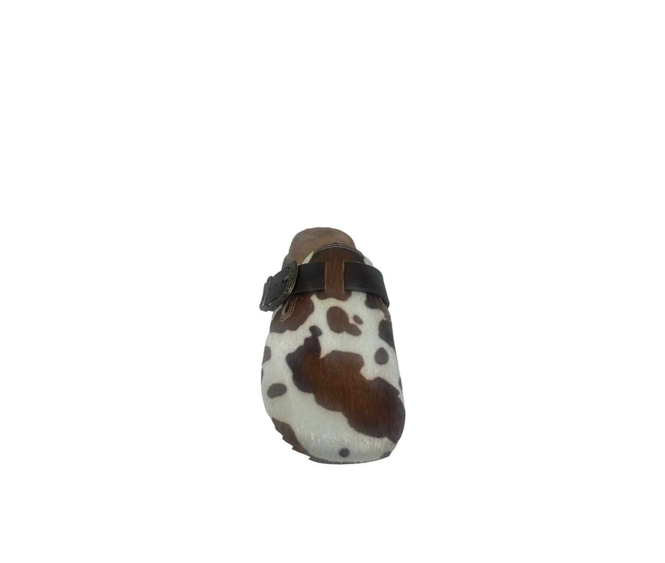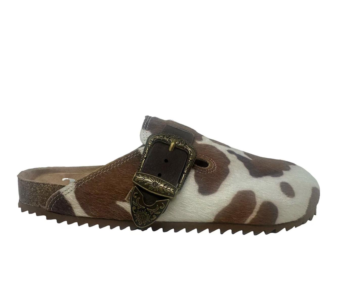 - Cow-print upper with buckle detail