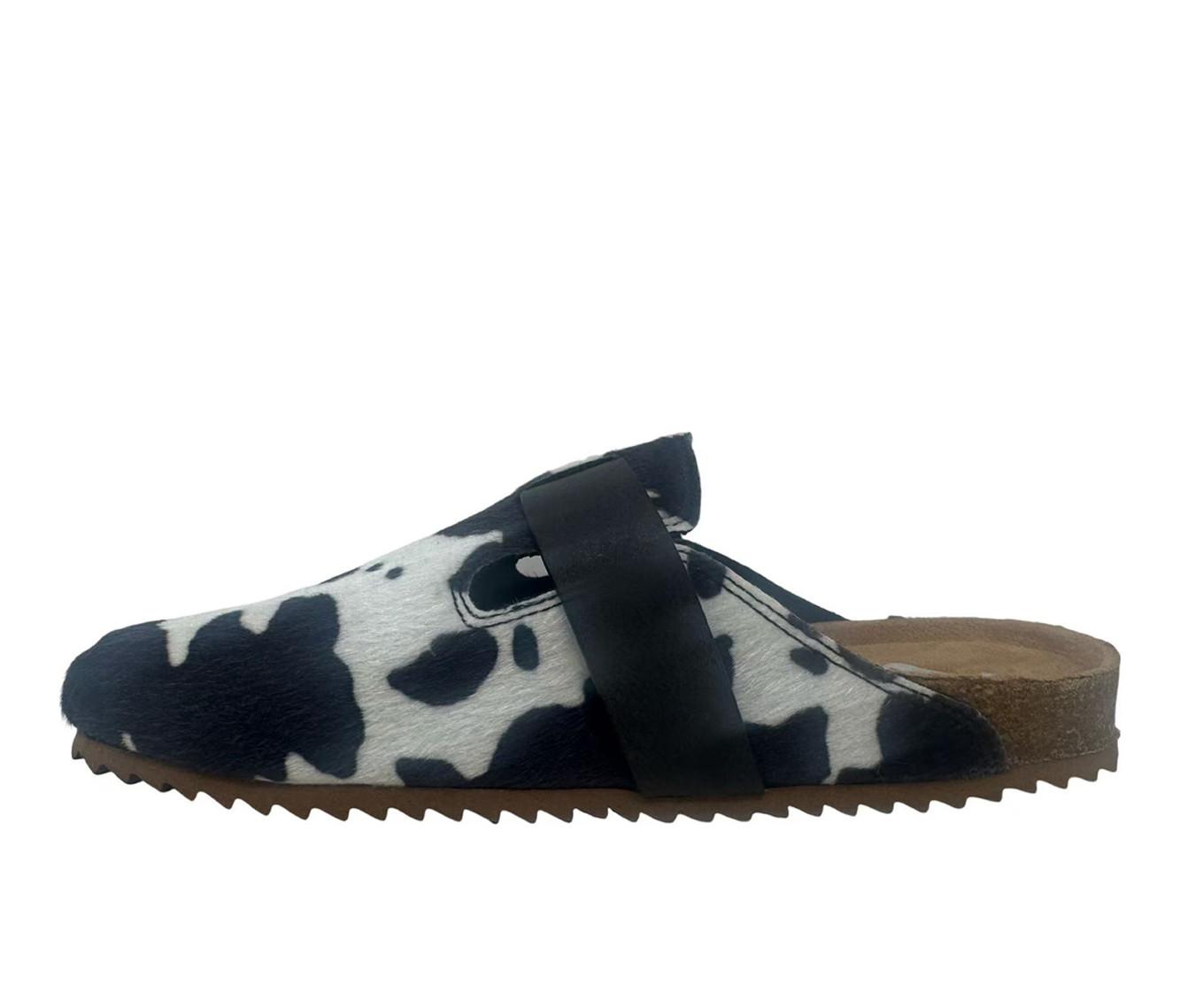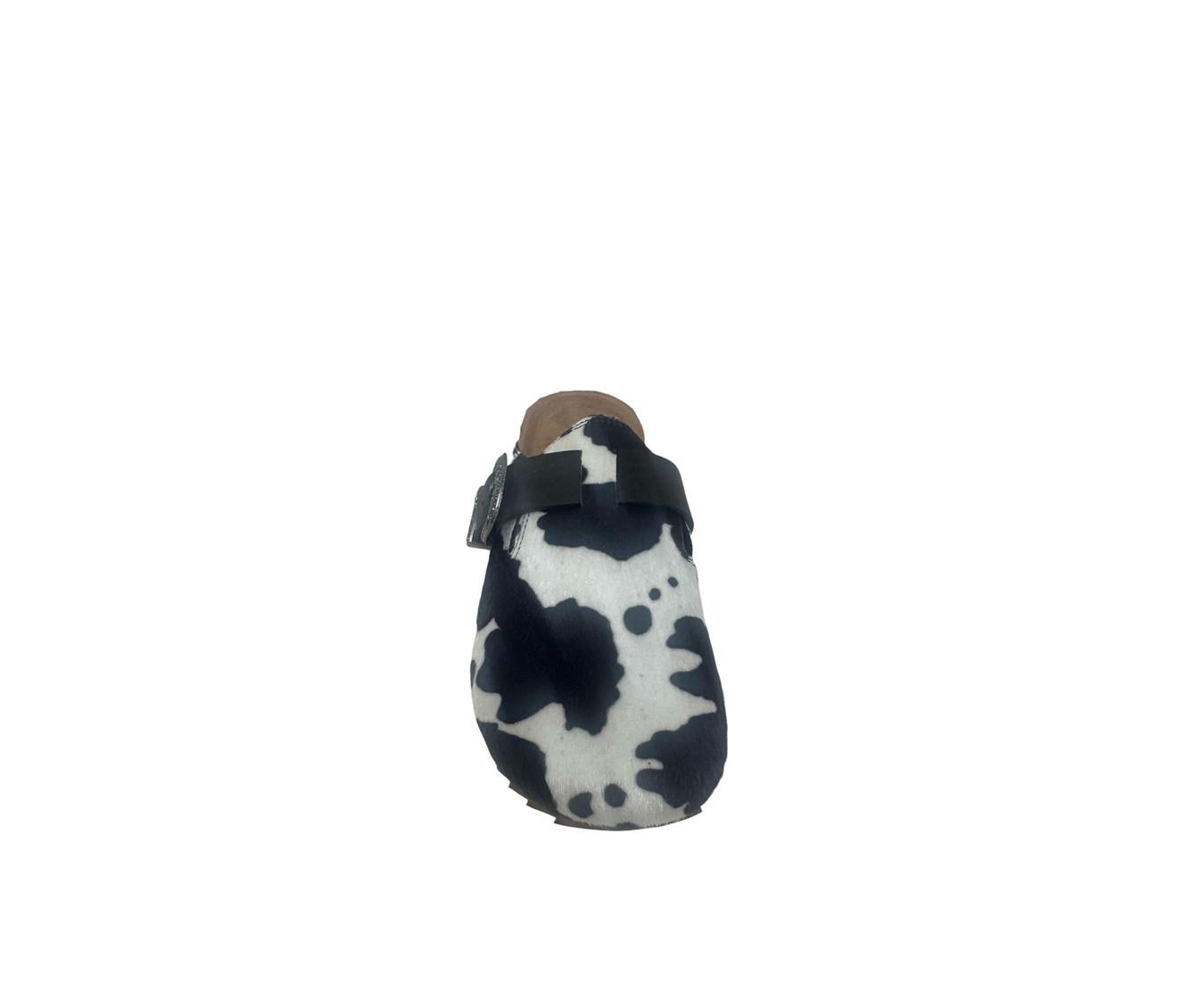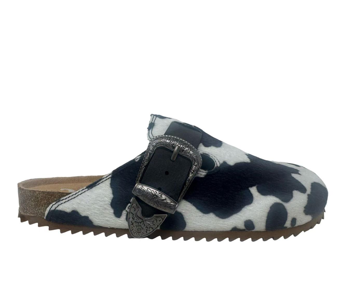 - Cow-print upper with buckle detail